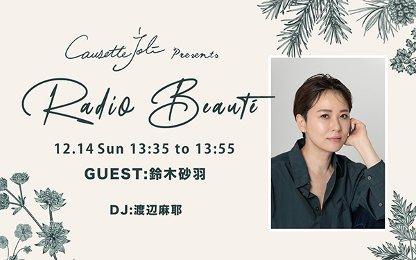 毎月第二日曜13:35頃~お送りする「Causette.Joli presents Radio Beauté」は、"指先から花、咲う"日本製ネイルブランドCausette.Joliとともに、いまを輝く人たちをゲストに迎え、自分流のライフスタイルについて考えるスペシャルコーナー。
