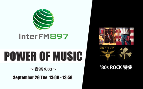9/29(火)13:00からのPOWER OF MUSICは、Bon Jovi、Duran Duran、Huey Lewis & The Newsなど、今なお色褪せない、'80s Rockのメガヒットをノンストップでお送りしていきます。