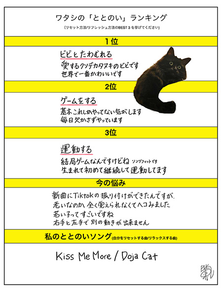 サウナーではないという雫さんですが、日々どんなふうにリラックスしているのか、早速「ととのい」ランキングをみていきました!